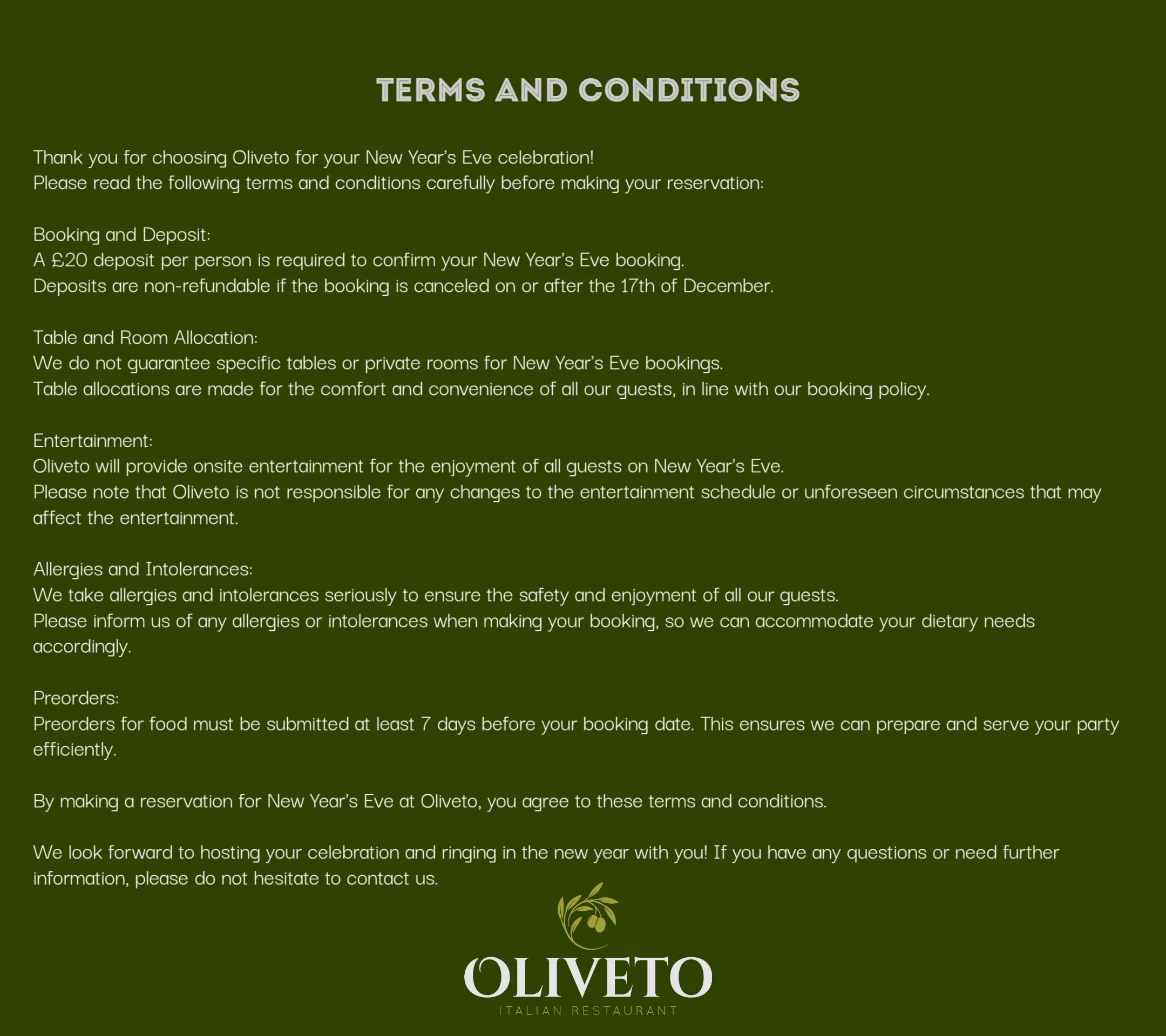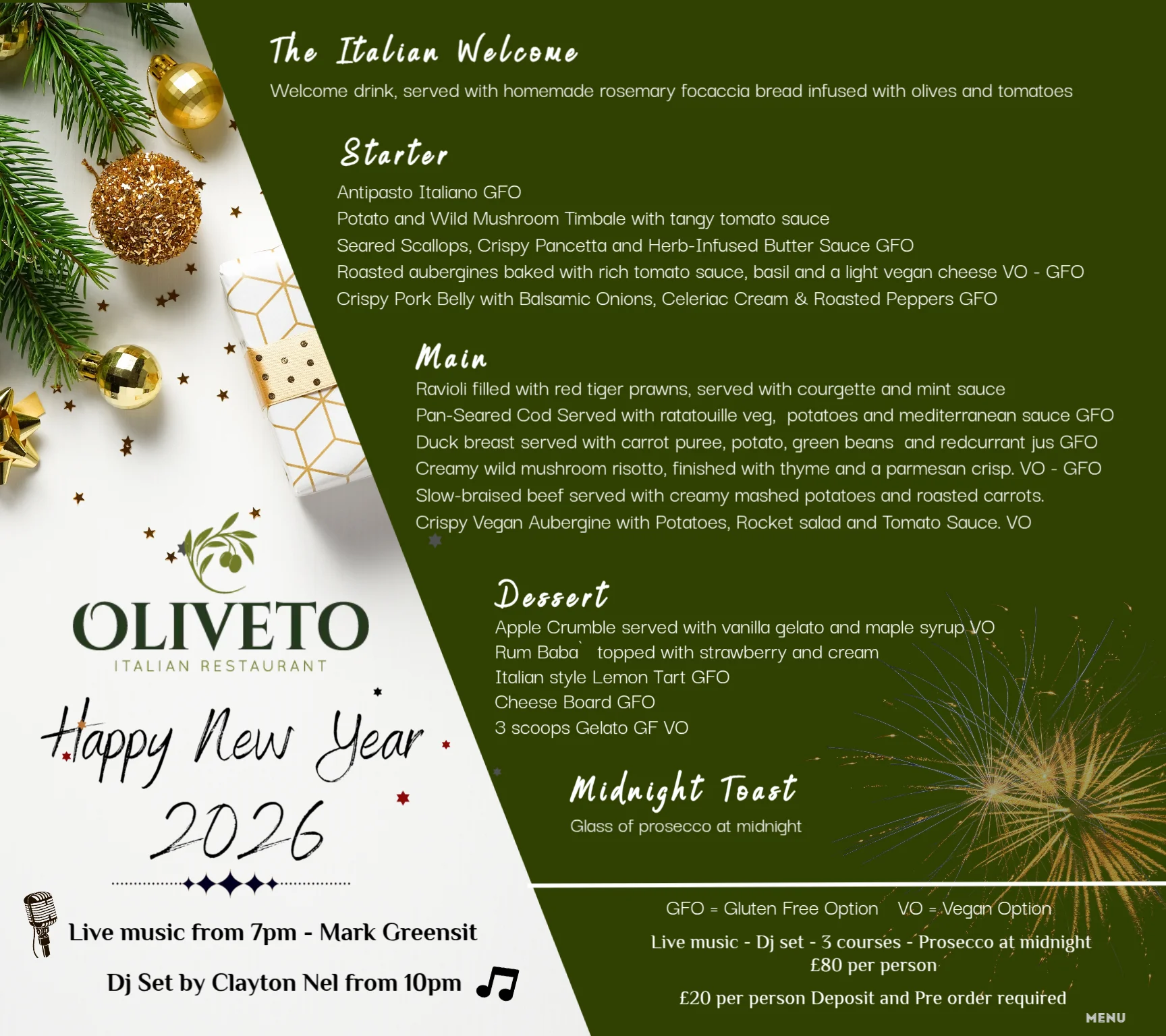 Celebrate the New Year with us at Oliveto! Enjoy an unforgettable evening with great food, a vibrant atmosphere, and live entertainment. Our singer and DJ will be performing from 7pm until late, creating the perfect setting to welcome 2026 in style.